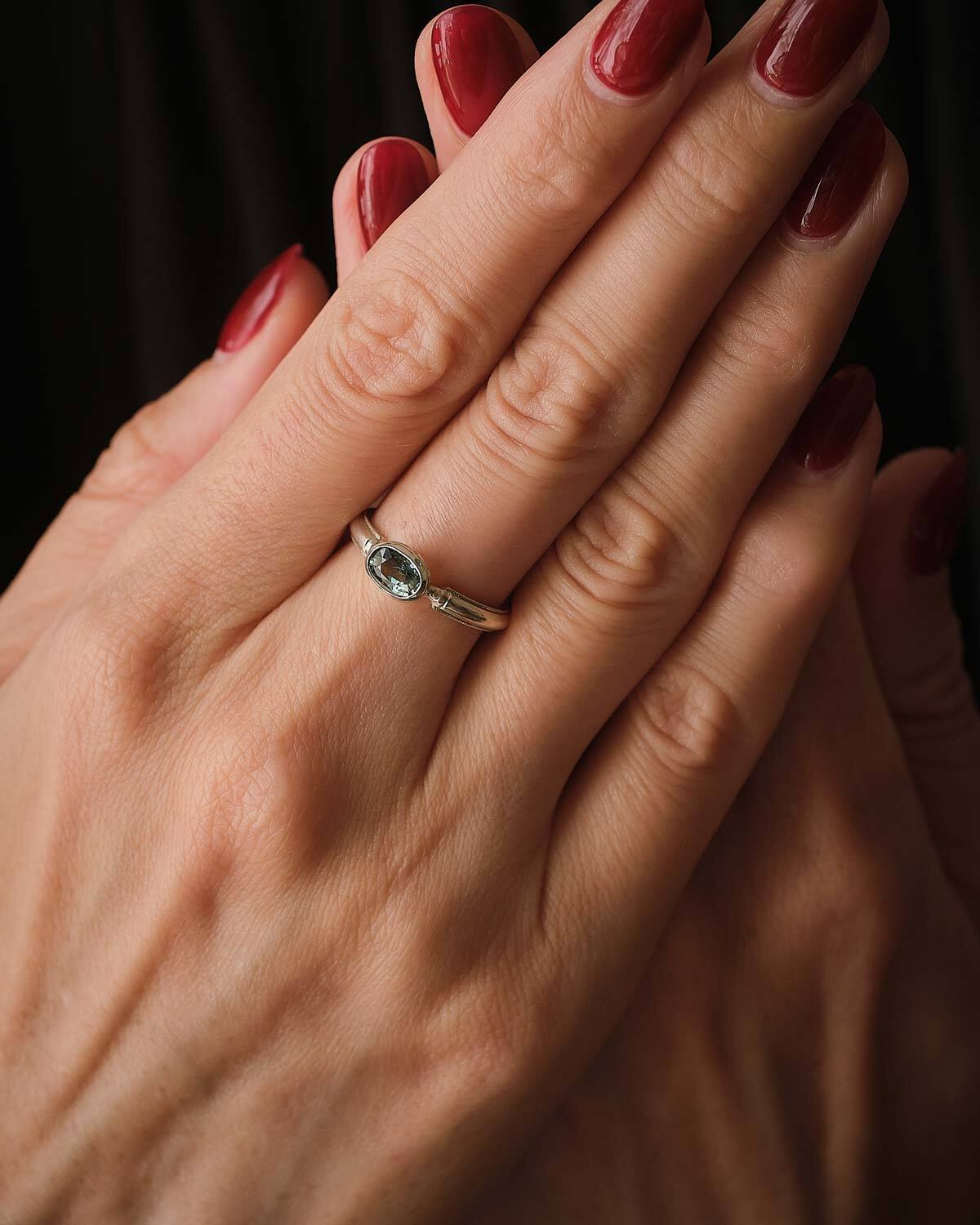 水色と緑の多色性が魅力的なアフリカ産のサファイアを使用してクラシカルな印象の指輪です。
