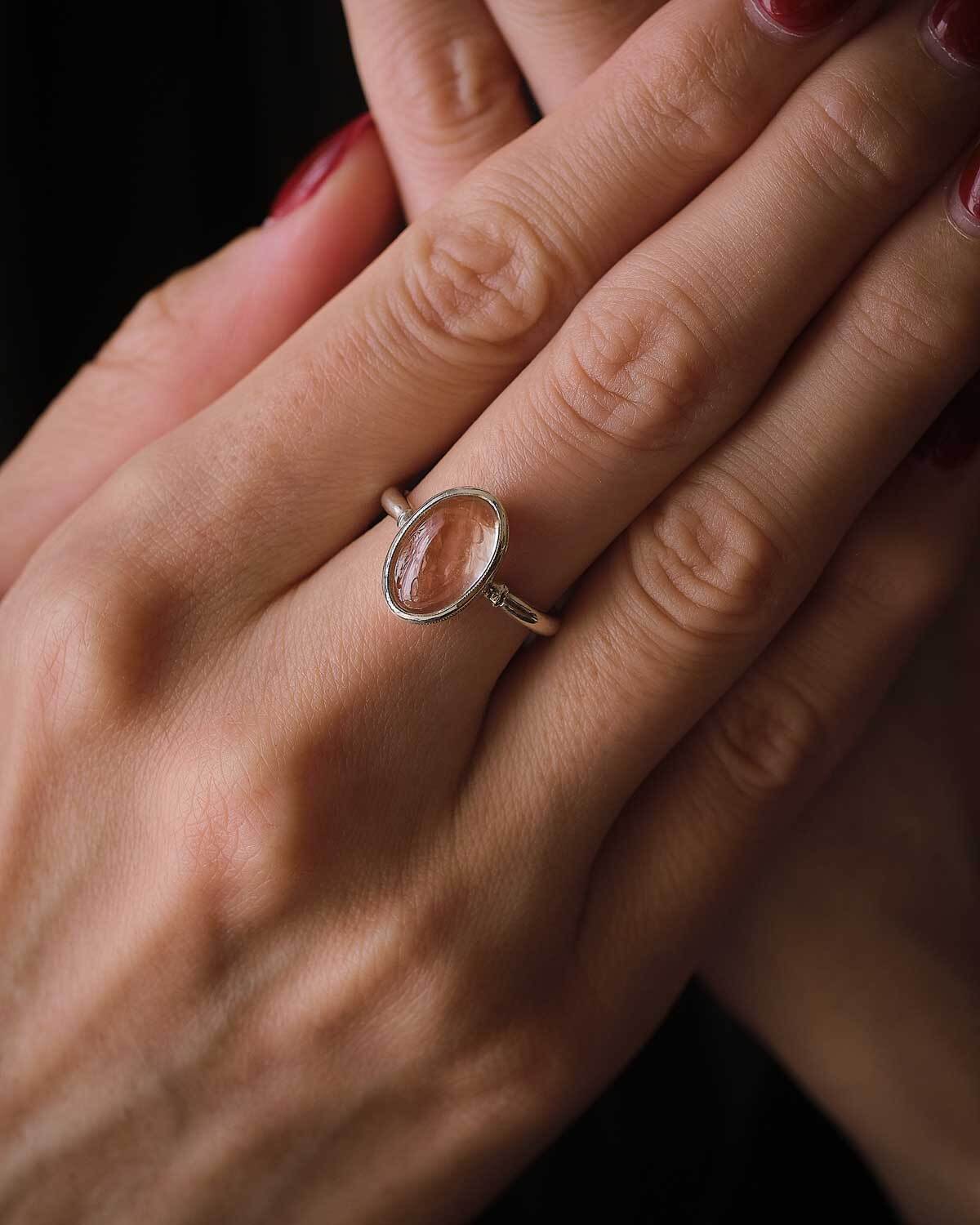 石の色はペールオレンジ〜イエローで、その透明感の高いドームの中に粒状の赤い粒が層になって閉じ込めらています。