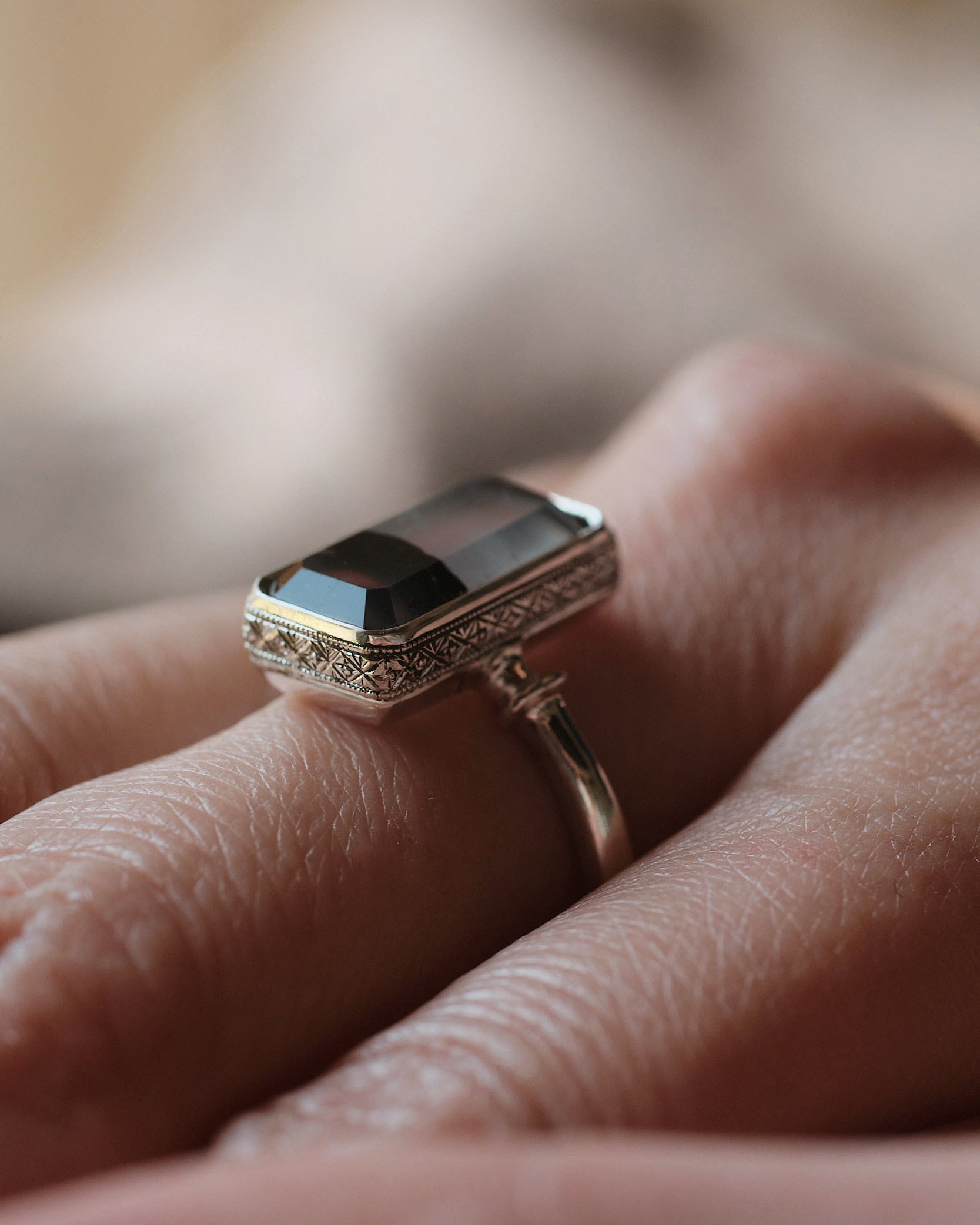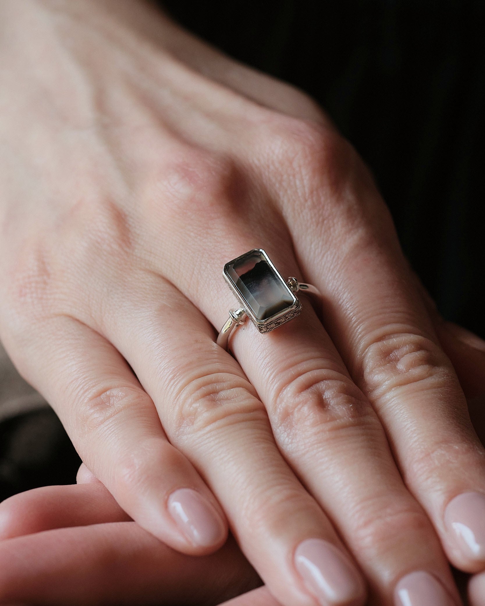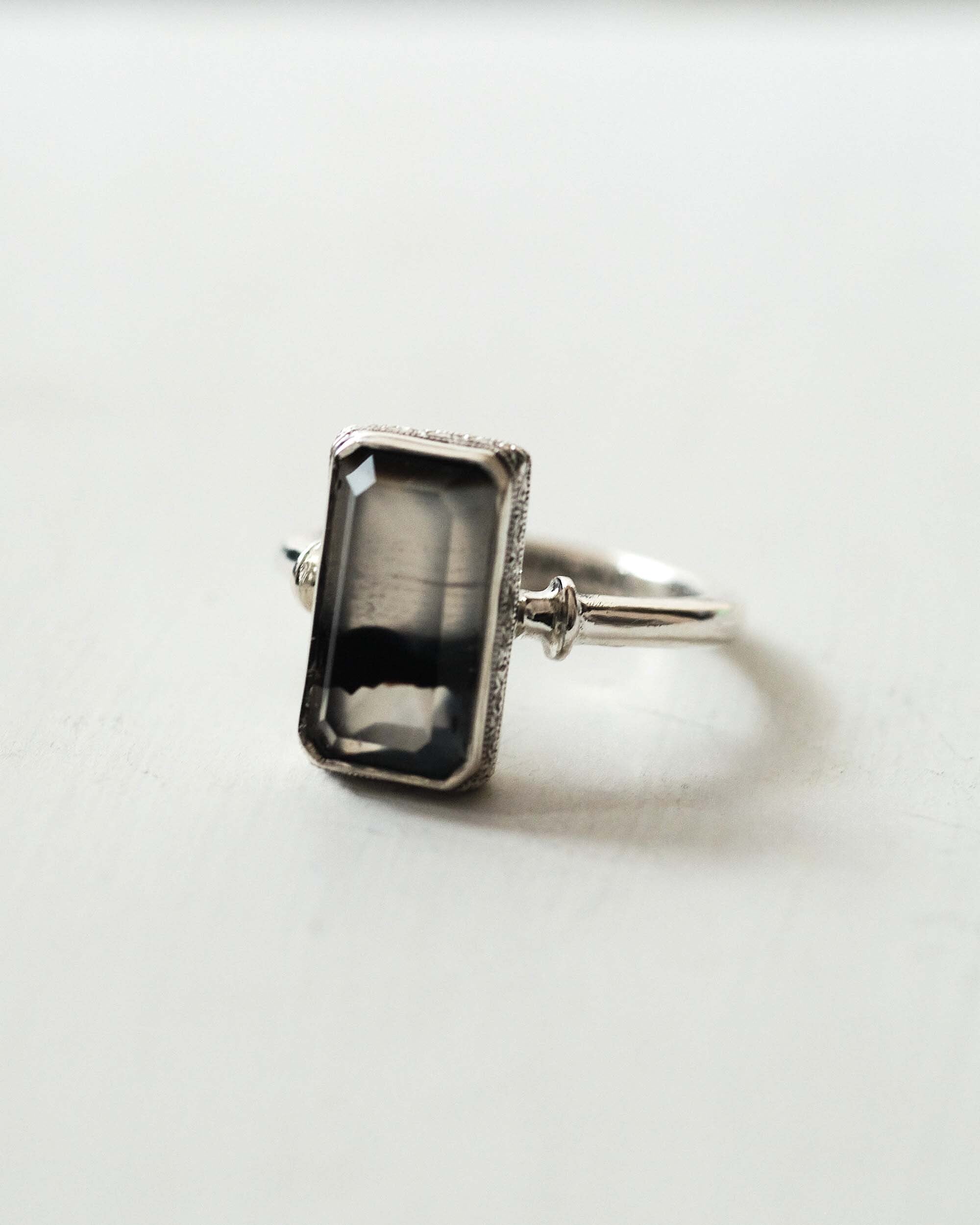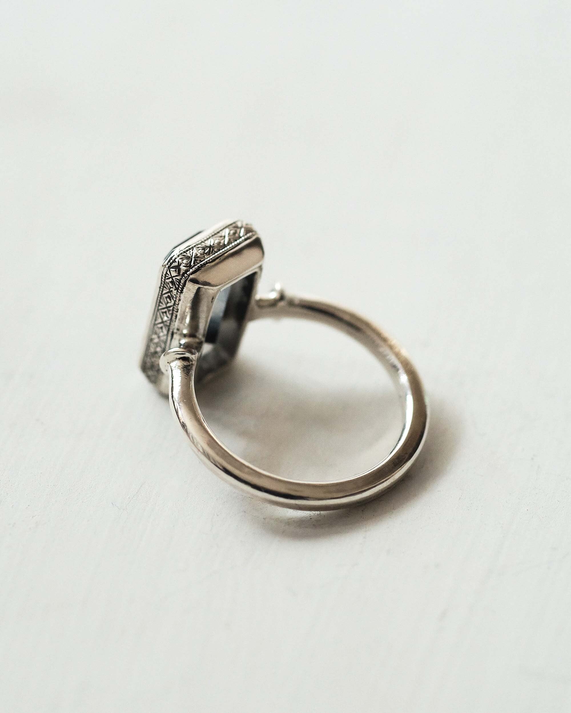白と黒のコントラストと切り立った石のエッジ、石座のサイドに施した彫りも相まって静謐で神秘的な雰囲気の指輪になっています。