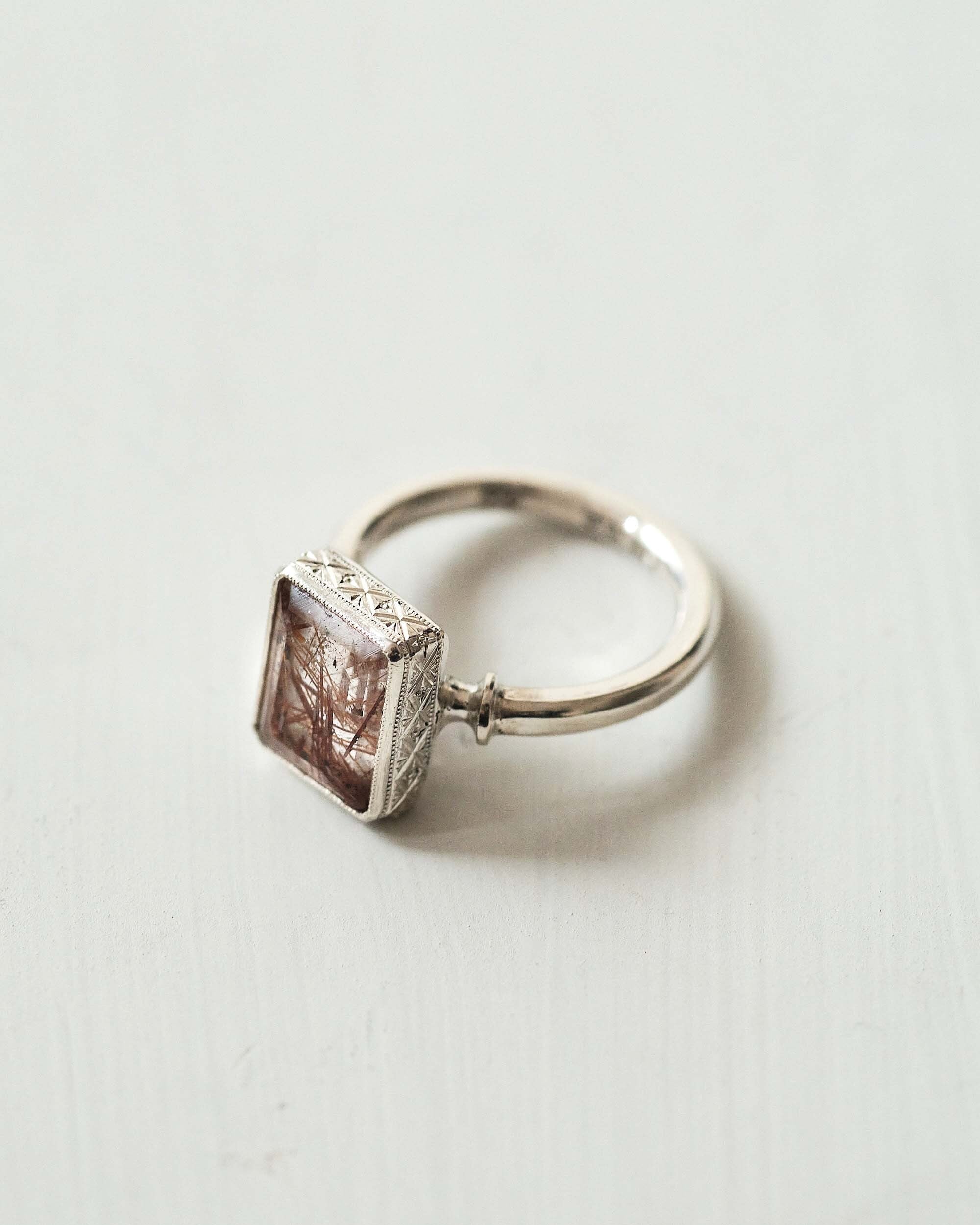 一般的な黄色のルチルクォーツとはまた少し異なった印象の赤いルチルが閉じ込められた石です。二酸化チタンが針状に結晶化しています。